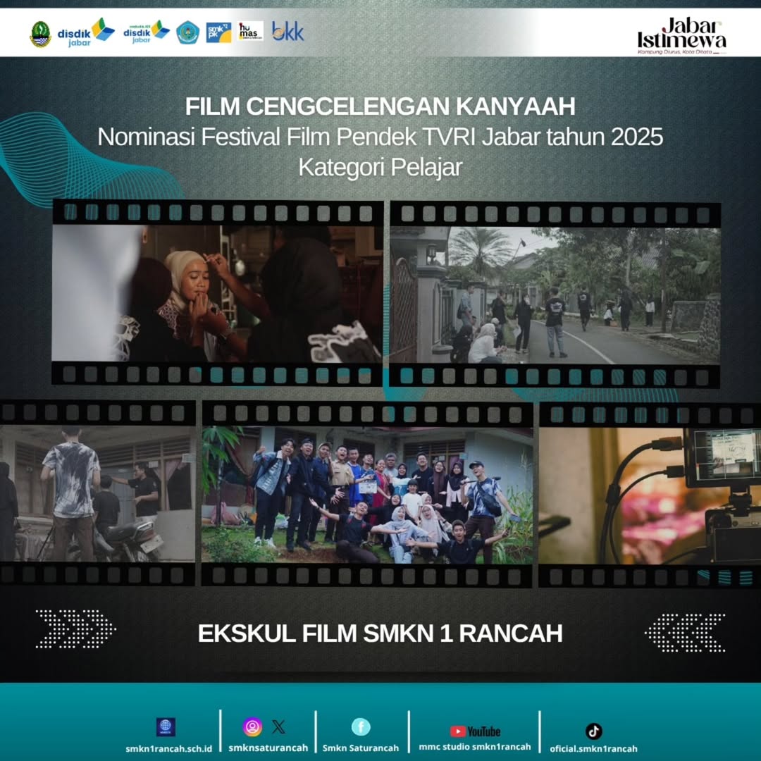 SMK Negeri 1 Rancah mengucapkan selamat dan sukses atas prestasi membanggakan yang diraih oleh Film Cengcelengan Kanyaah, karya Ekstrakurikuler Film SMKN 1 Rancah, yang berhasil masuk nominasi Festival Film Pendek TVRI Jawa Barat Tahun 2025 pada kategori Pelajar.