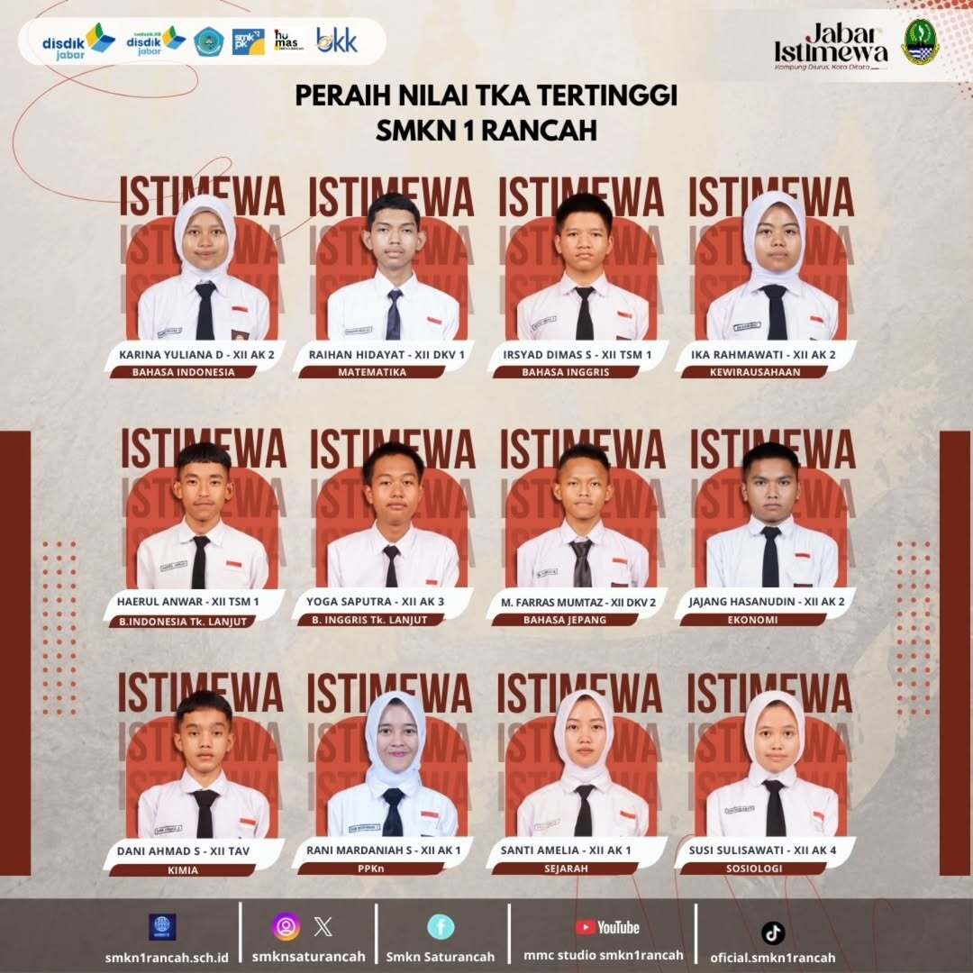 SMK Negeri 1 Rancah menyampaikan apresiasi setinggi-tingginya kepada para peserta didik yang berhasil meraih Nilai Tes Kemampuan Akademik (TKA) Terbaik. Prestasi membanggakan ini menjadi bukti nyata dari kerja keras, kedisiplinan, serta semangat belajar yang konsisten dalam mengikuti proses pembelajaran.